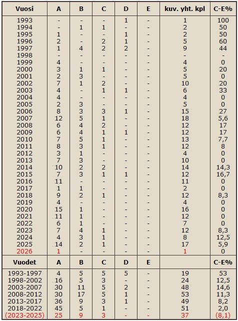 Taulukko1: Pitkäkarvainen saksanseisoja, lonkkakuvaustilasto 1993-2026.